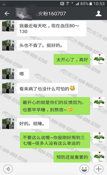 西安的张女士,2015年9月4日就开始关注我们的产品并且添加了我们的微信,开始在微信上咨询我们的产品,多次咨询我们家的产品,我们家的客服一直耐心解答,于2016年7月7日张女士终于下定决心要购买我们家产品,用于治三高,之前买的吃了都没见效果,吃了我们家三七40天后很开心的向我们分享她的喜悦之情,血压控制在80-130,以前头晕的情况也改善了。很认可我们福万家的产品,并且已向周边的朋友推荐我们福万家的产品,以下是效果反馈图:具体咨询:400-800-3250