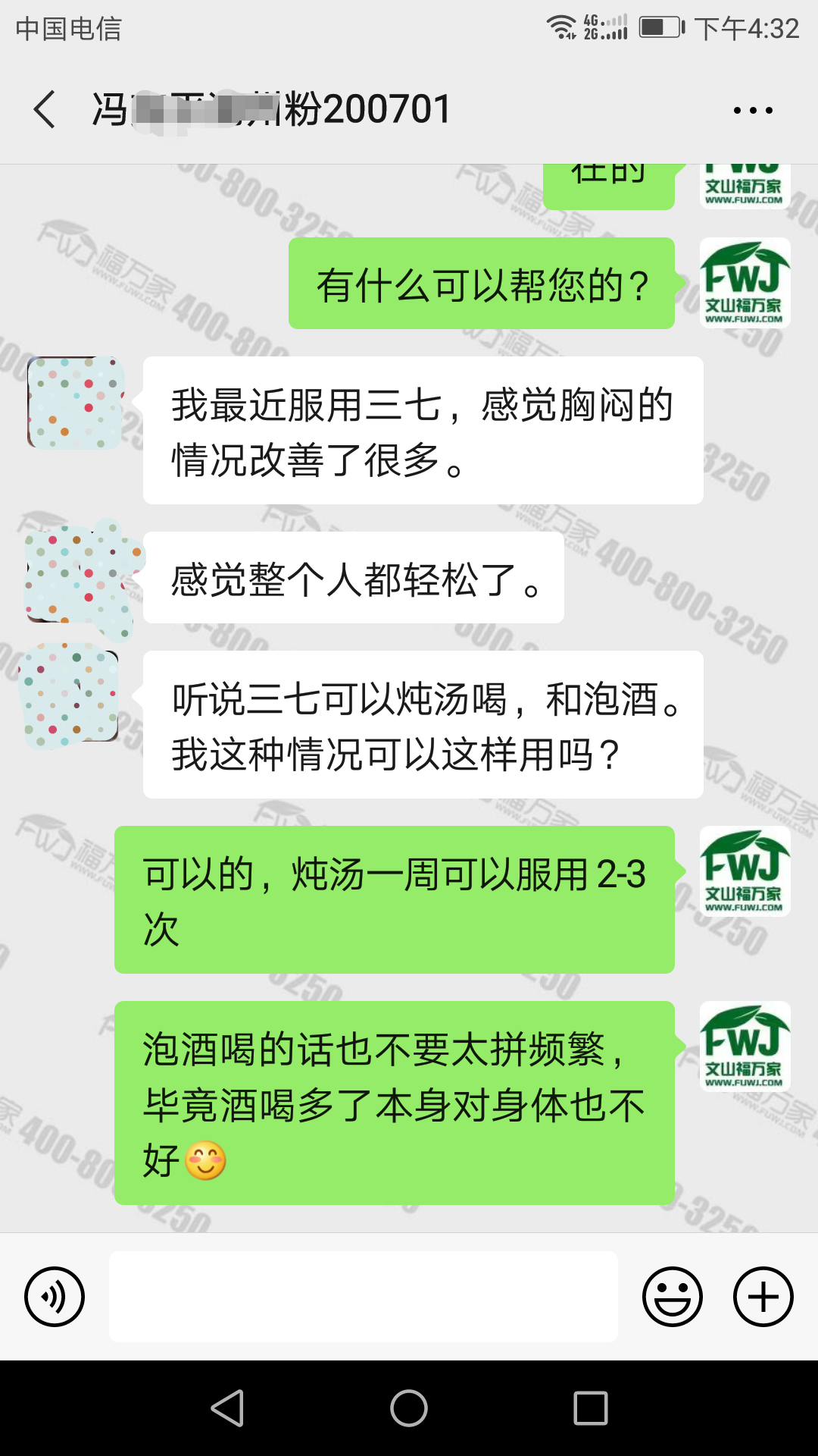冯先生反馈用福万家三七后胸闷的情况得到了改善