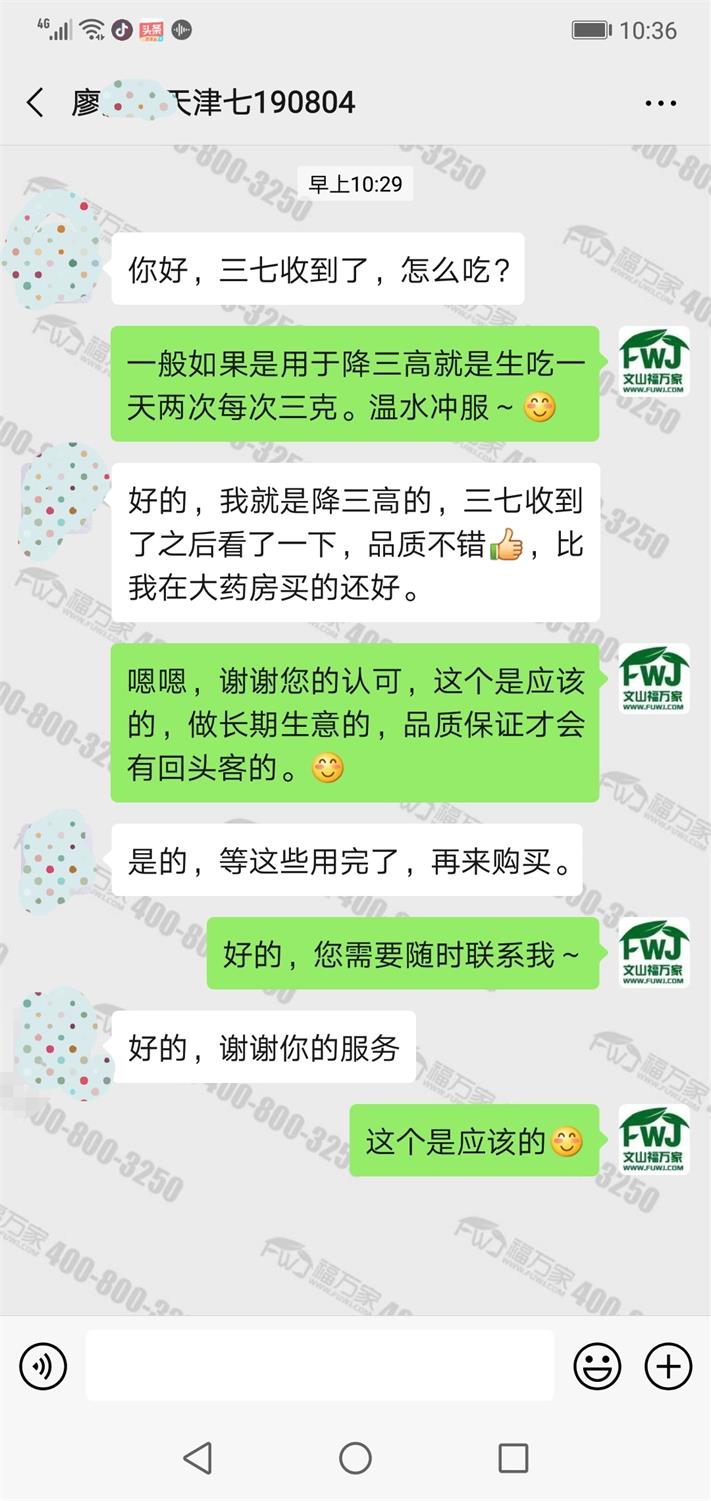廖女士一直在用三七,今天购买收到后反馈,福万家三七品质不错,比自己在大药店买的还好。对我们质量很满意。