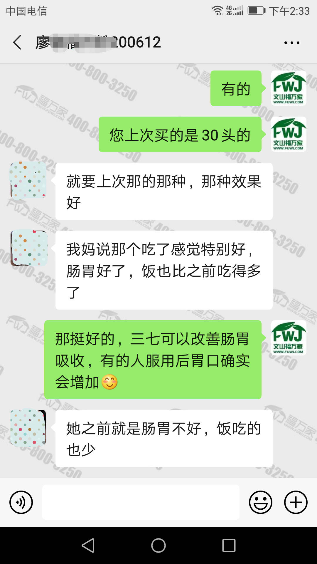 廖女士反馈母亲用福万家三七后肠胃变好了