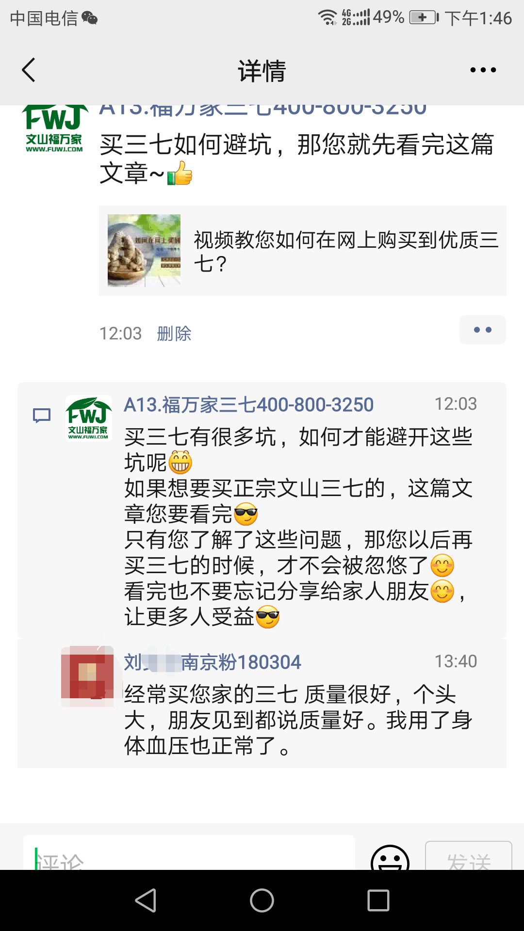 刘女士是我们多年老客户,一直在吃福万家三七,现在血压正常,对我们的质量很满意。