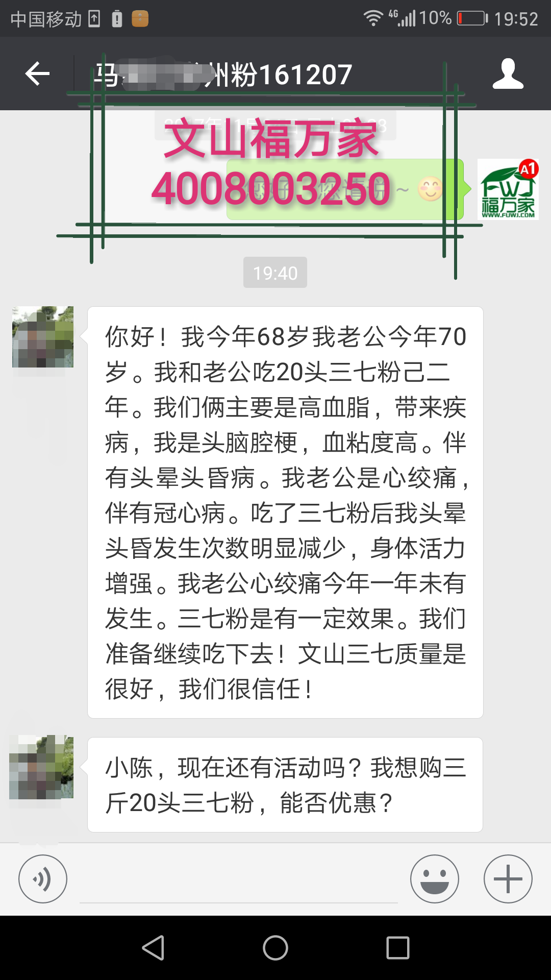 常州马女士反馈,她和老公吃我们福万家三七已有两年,她是头脑腔梗、血粘度高伴有头晕症状,现在头晕头昏明显减少,身体活力增强了。她老公是心绞痛伴有冠心病,现在心绞痛一年未发生了。用的效果不错,会继续吃,对我们品质很信任。
