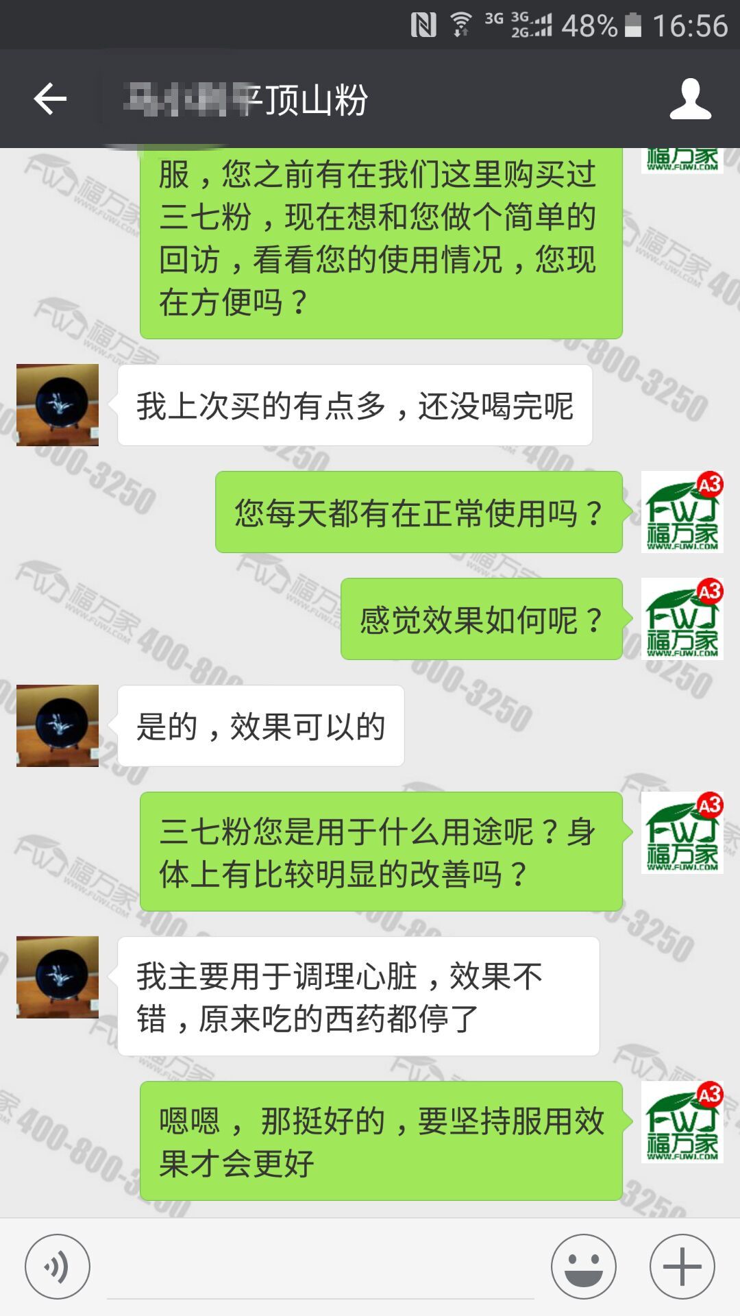 平顶山的马女士,15年5月第一次在我们福万家购买了1斤20头的三七粉,到了12月份就和我们反馈,说自己心脏方面的毛病好很多,感冒也少了,觉得我们家的三七比市场上的好太多,并且又重新订购了3斤三七粉。到今年8月,我们再次给马女士做回访的时候,马女士说她现在心脏方面的西药都停了,效果很好,还对我们表示了感谢。具体咨询:400-800-3250