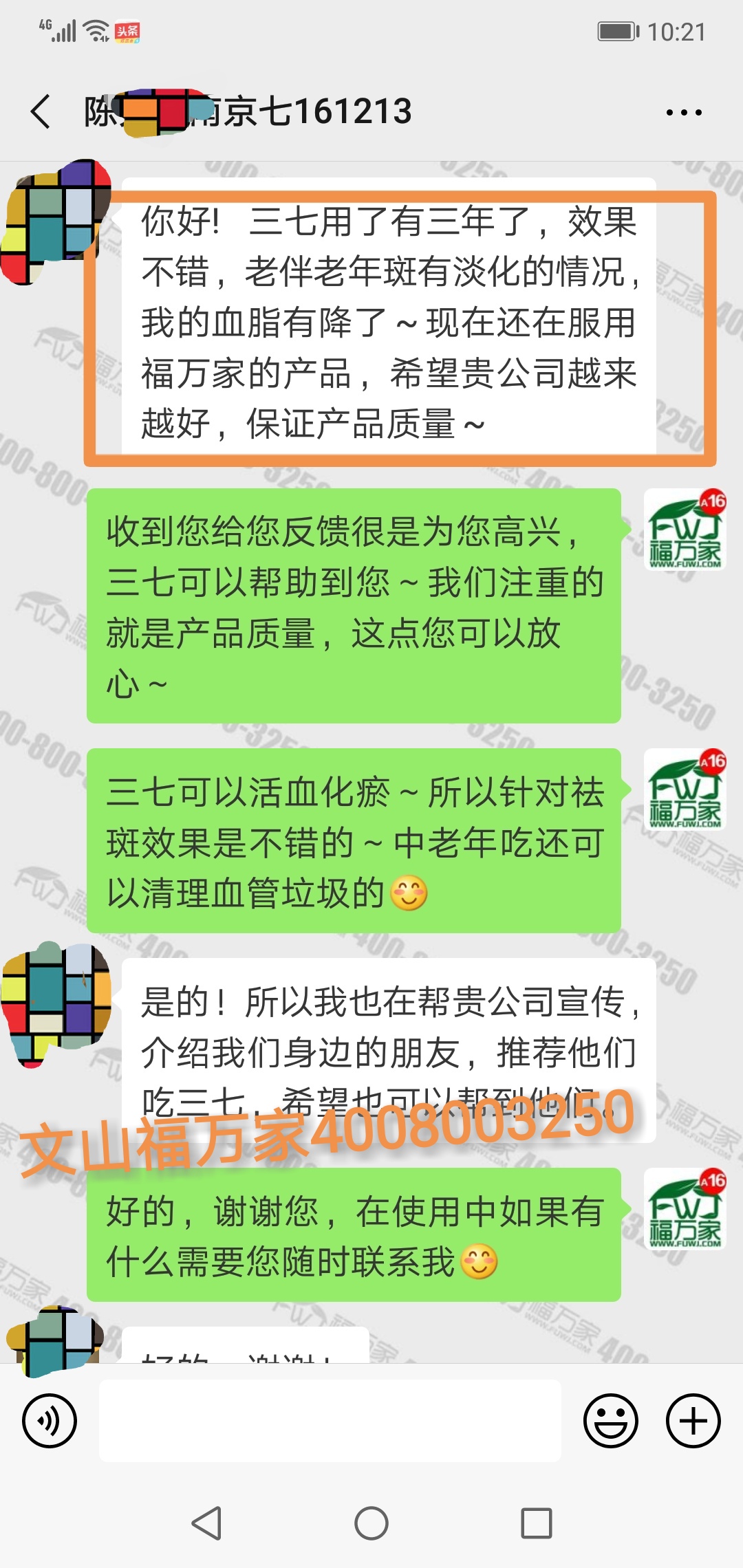 陈先生吃我们福万家三七后反馈,效果不错,老伴老年斑有淡化的情况,自己的血脂有降了,现在还在坚持吃三七。