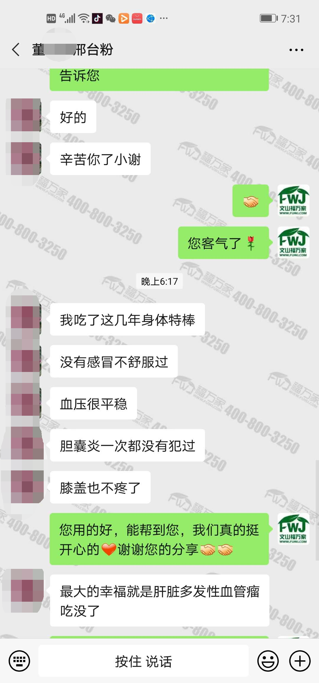 董女士一直在吃我们福万家三七,现在身体很好,血压平稳,胆囊炎和心跳间歇也没有犯过,肝脏性血管瘤也没有了。