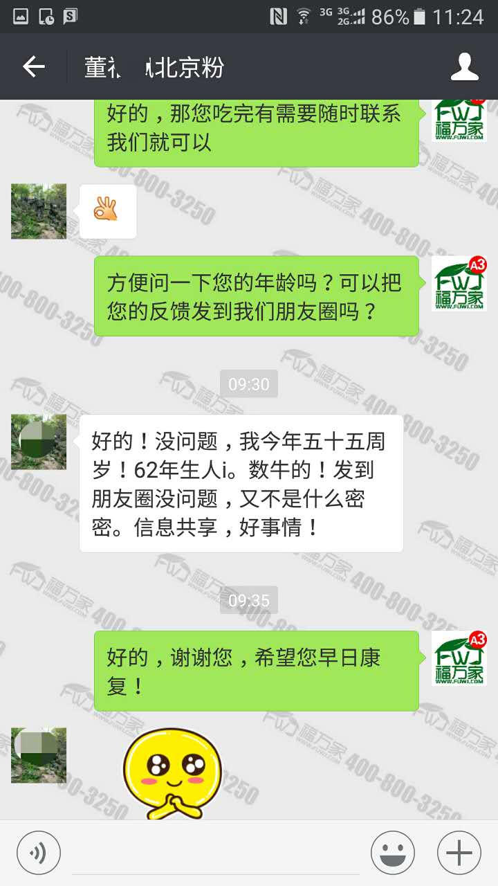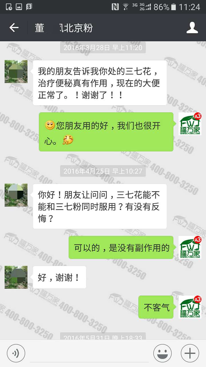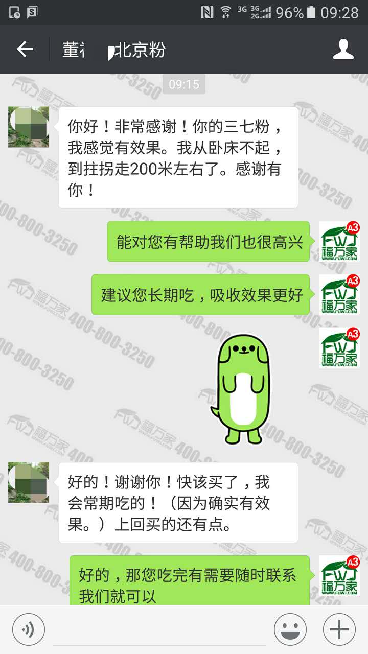 北京的董先生,吃了我们的三七粉一年多,从以前卧床不起,现在都能杵拐走200米左右了,效果确实是不错。另外他朋友用我们的三七花,反馈对便秘有帮助,大便正常了。具体咨询:4008003250