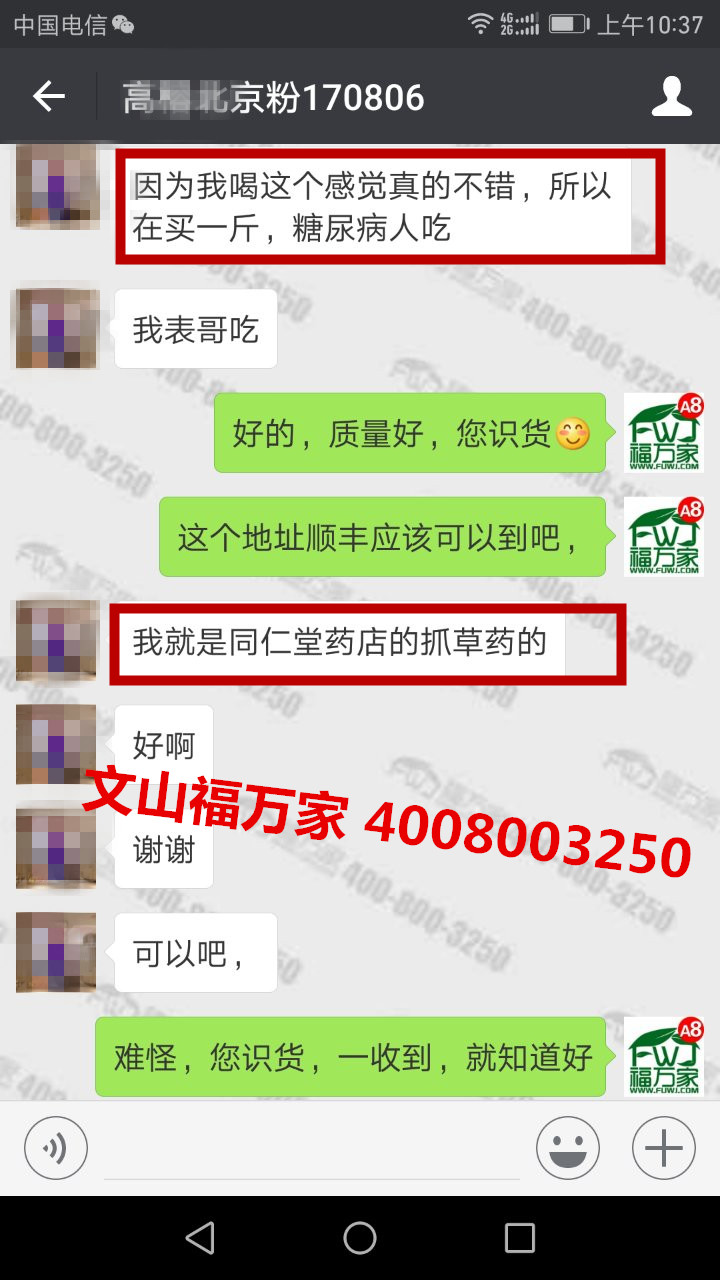 北京的高女士月经不调,买我们三七粉吃了几天,感觉很不错。她是在同仁堂负责抓药的,收到我们福万家三七粉后很认可质量。她全家人都在同仁堂,对品质要求高,也识货。所以又帮表哥订购了一斤最好的20头的,用于调理糖尿病。