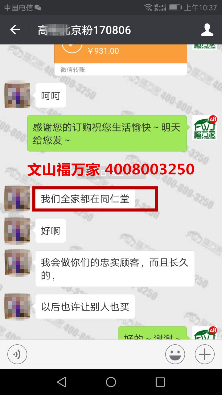 北京的高女士月经不调,买我们福万家三七粉吃了几天,感觉很不错。她是在同仁堂负责抓药的,收到我们福万家三七粉后很认可质量。她全家人都在同仁堂,对品质要求高,也识货。所以又帮表哥订购了一斤最好的20头的,用于调理糖尿病。文山福万家,更多反馈:http://www.wskwj.com.cn/kehufankuianli/