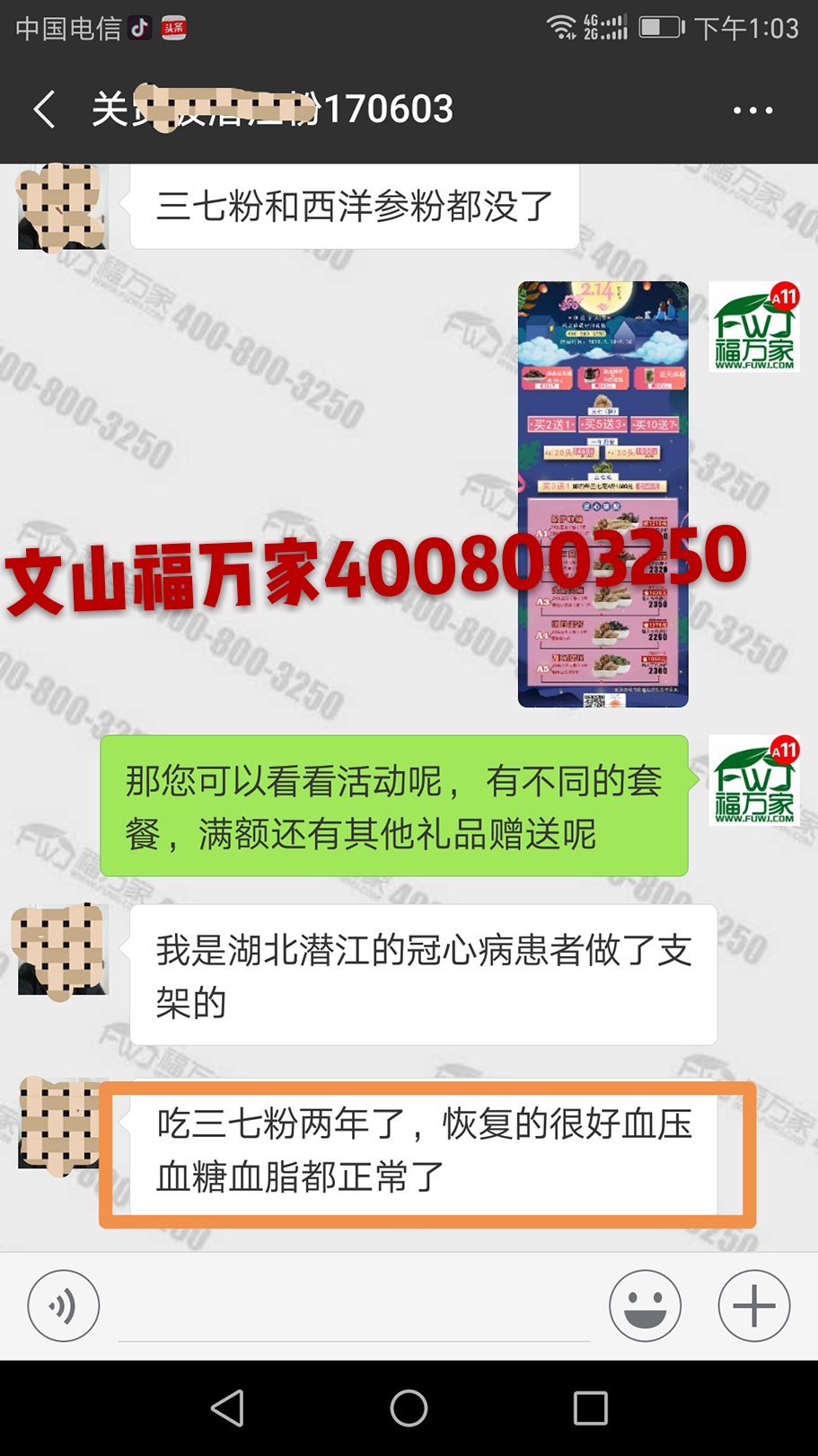 湖北的关先生冠心病,做过支架,另外血压血脂血糖都偏高。吃福万家三七粉搭配西洋参和丹参差不多两年,反馈身体恢复得很好,血压血脂血糖都正常了。
