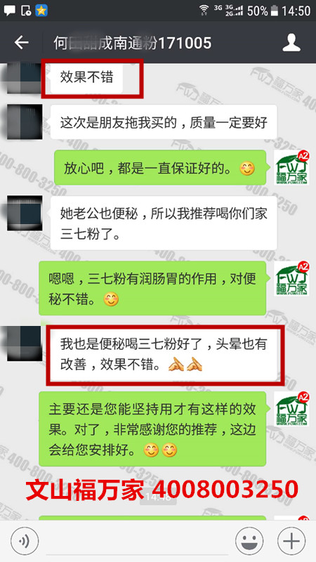 何女士吃我们福万家三七半年,反馈便秘好了,头晕也有改善。因为用的好,相信我们的品质,所以介绍给朋友了。