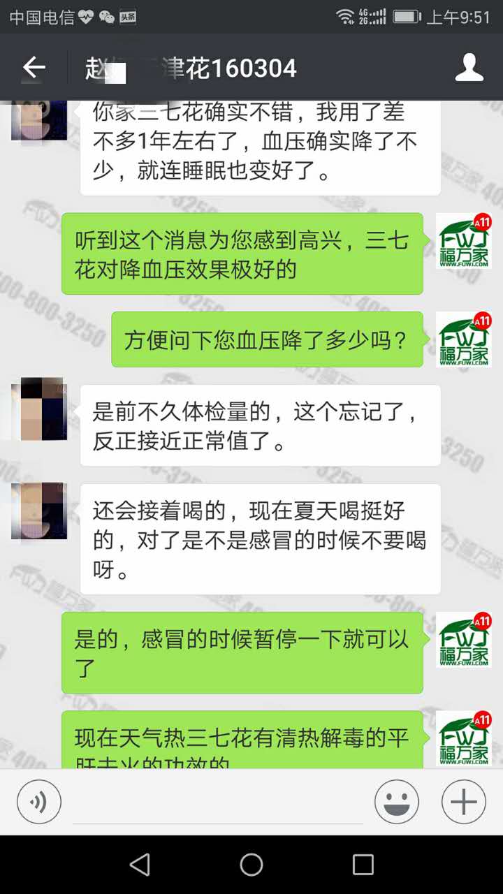 天津赵女士喝三七花有1年了,今天反馈说,喝了福万家三七花之后不仅睡眠好了,连血压也降了很多了,现在都接近正常值了,会一直坚持吃的。
