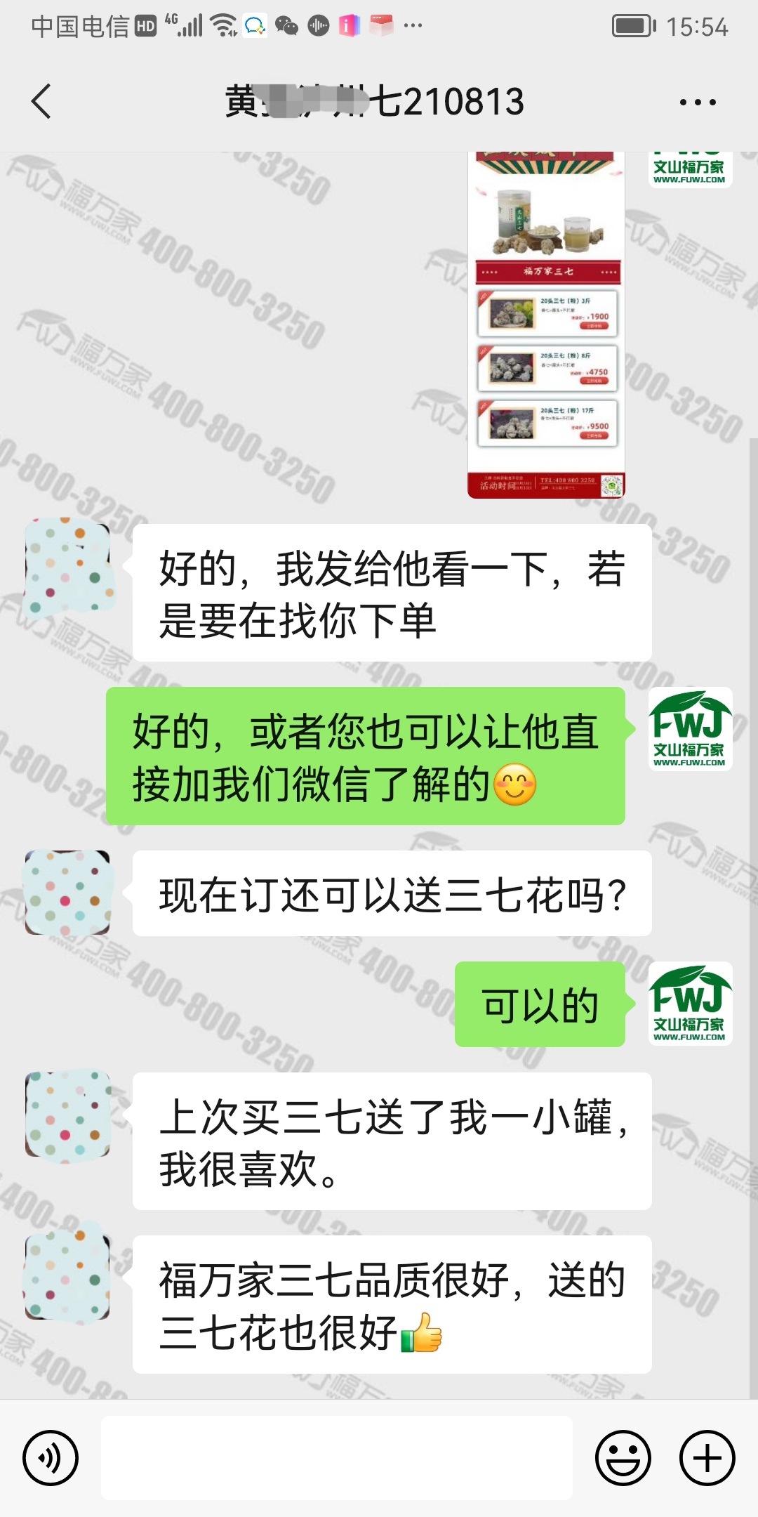 黄先生反馈我们福万家三七品质很好,三七花也很好,对质量很满意,还推荐给了朋友。