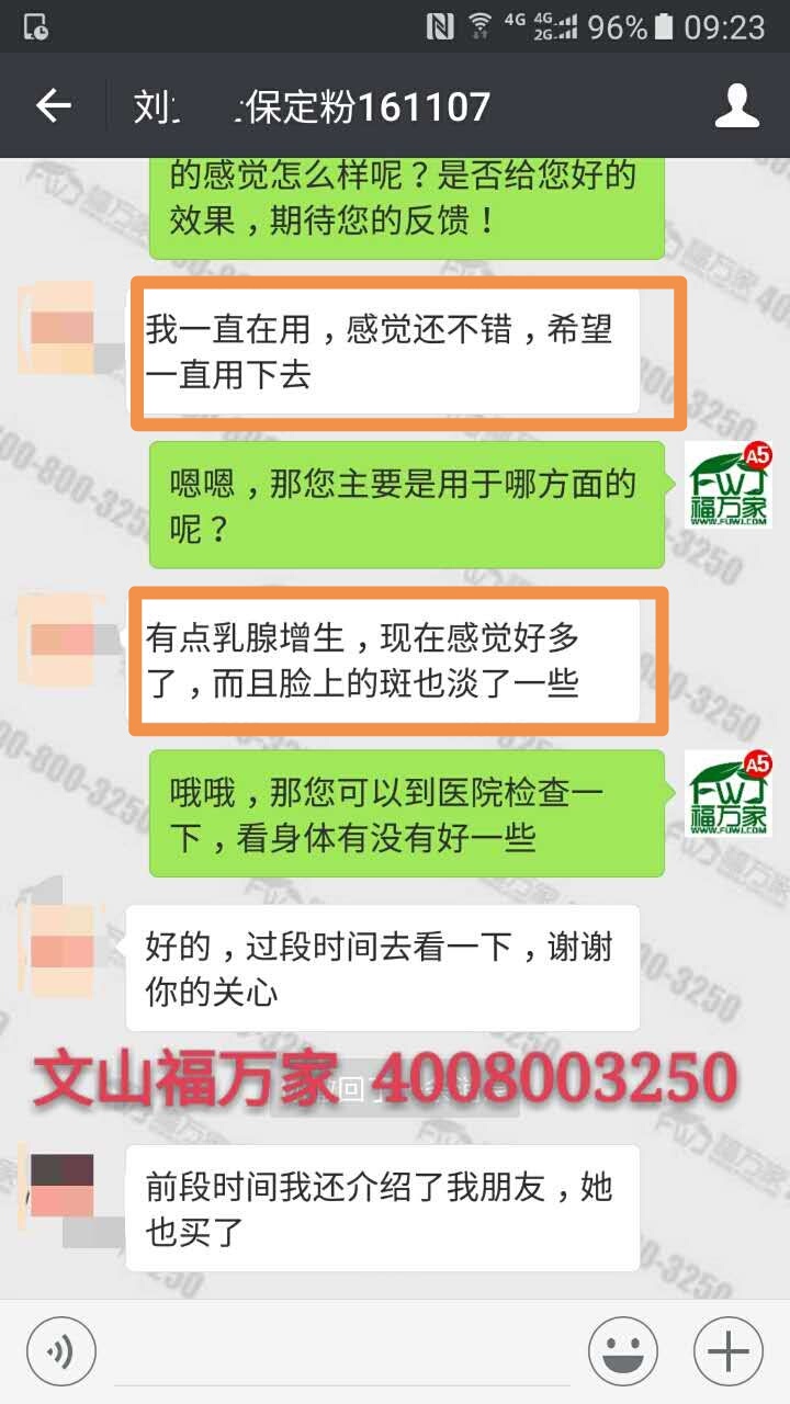 保定的刘女士吃福万家三七粉九个多月后反馈说:自己一直在坚持用,感觉还不错,之前有点乳腺增生,现在感觉好多了,而且脸上的斑也淡了一些,自己用的很好,还介绍了朋友来买。