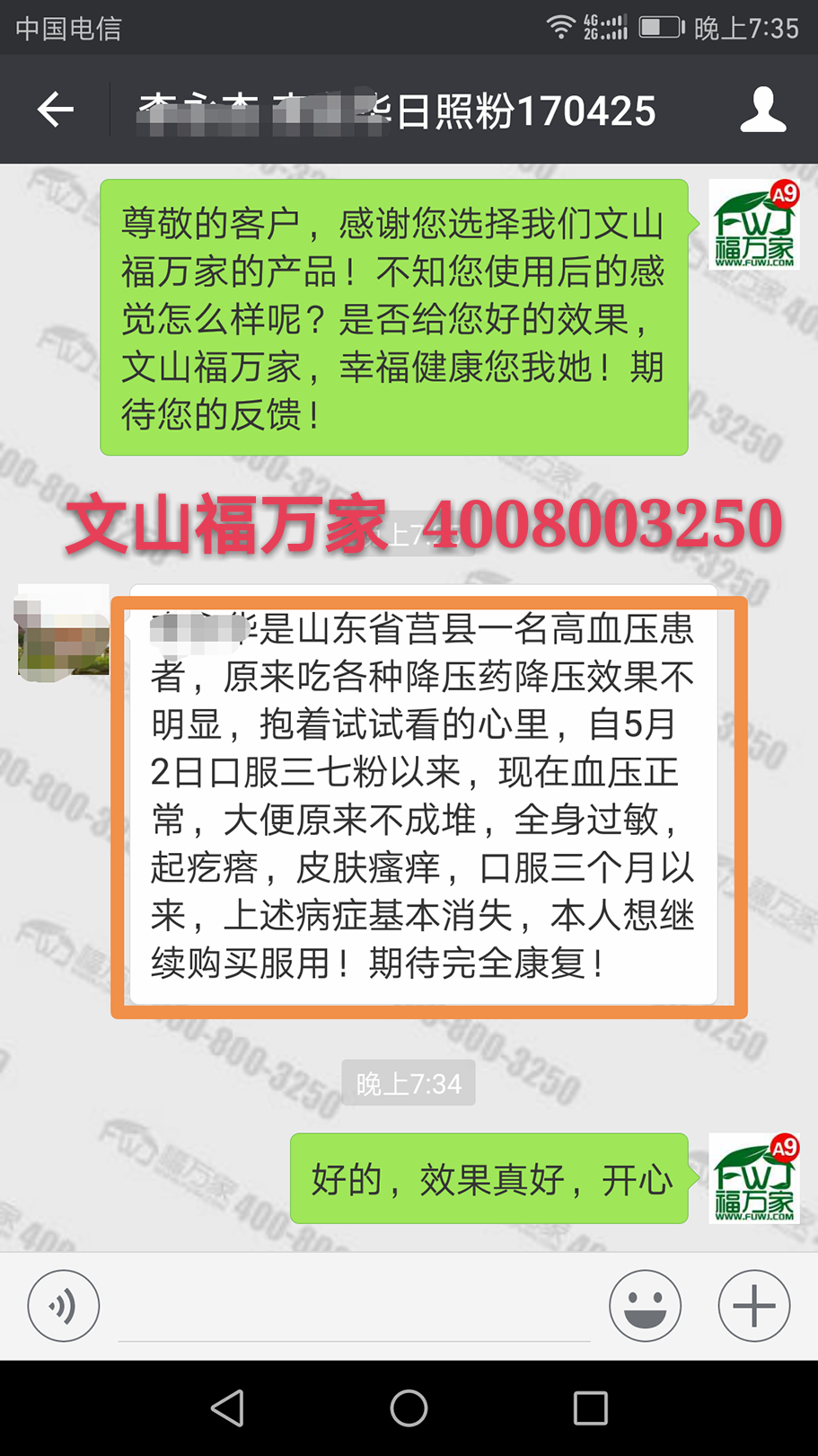 山东的李先生有高血压,平时吃降压药效果也不明显,皮肤瘙痒,大便不成形。服用了我们福万家三七粉三个多月,现在血压正常了,皮肤瘙痒,大便不成形这些病症也都基本消失了,效果很好。
