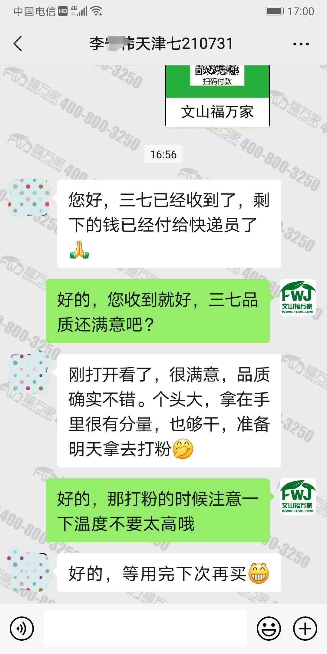 李先生收到福万家三七后反馈:三七品质确实不错,个头大,拿在手里很有分量,也够干,准备明天就拿去打粉,对三七的质量很满意!使用效果因人而异,仅供参考!好的高品质三七,才有好效果。认准文山福万家,一天几块钱,健康享老年。好三七,文山福万家,健康幸福您我她!4008003250