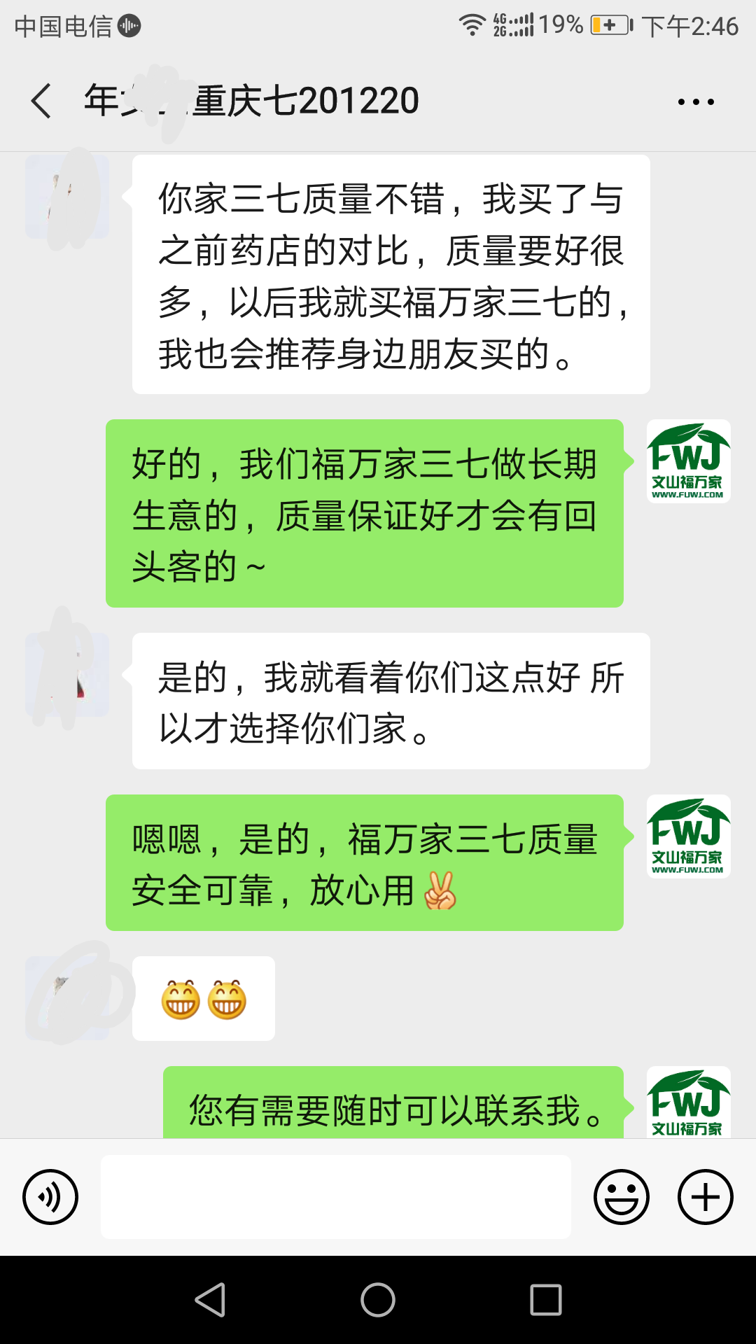 年女士第一次买福万家三七,收到后反馈质量很不错,比自己在药店买的好很多,以后就认准我们的品牌了!使用效果因人而异,仅供参考!好的高品质三七,才有好效果。认准文山福万家,一天几块钱,健康享老年。好三七,文山福万家,健康幸福您我她!4008003250