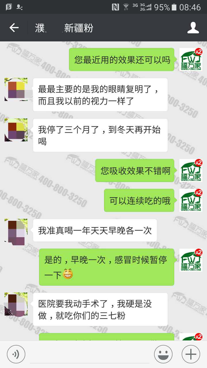 新疆的濮先生是脑囊肿 2.5mm压迫到眼神经造成左眼视力只有0.3。坚持每天喝福万家三七粉一年,眼睛复明了,而且跟以前的视力一样了。