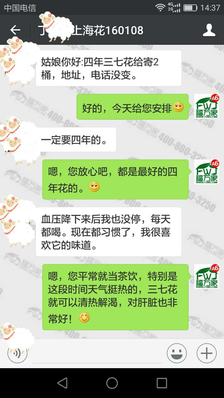 上海丁先生血压高,喝我们福万家三七花一年多了,血压之前就反馈降下来了。现在每天都有坚持喝,很喜欢三七花的味道。