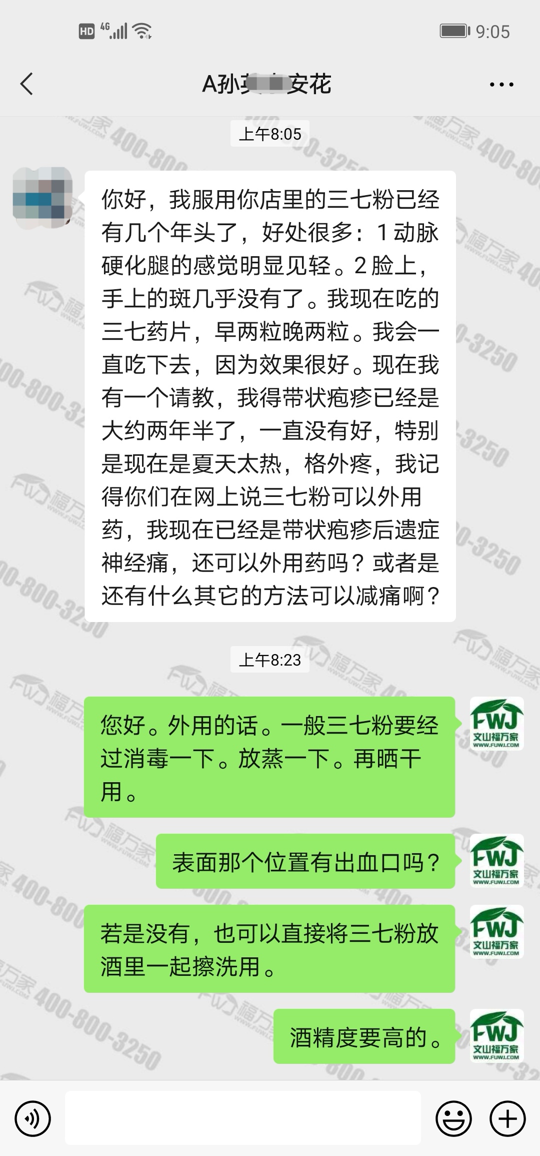 孙女士一直在吃我们福万家三七,最近反馈,动脉硬化腿的感觉明显见轻。脸上和手上的斑几乎没有了,效果很好。