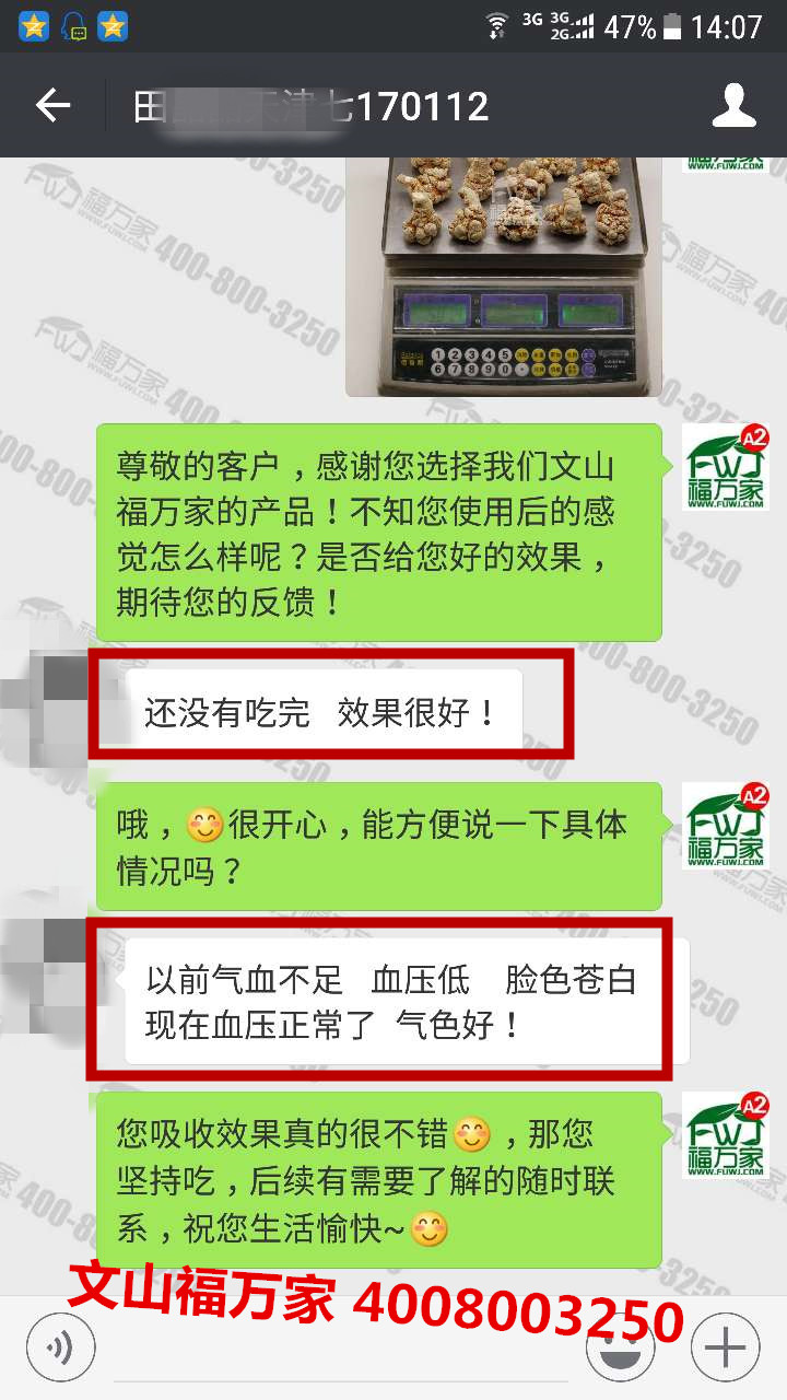 天津田女士之前气血不足、血压低,脸色苍白。吃我们20头福万家三七20头十个月,现在血压已经正常,气色也好了。有 的客户记得要熟吃。