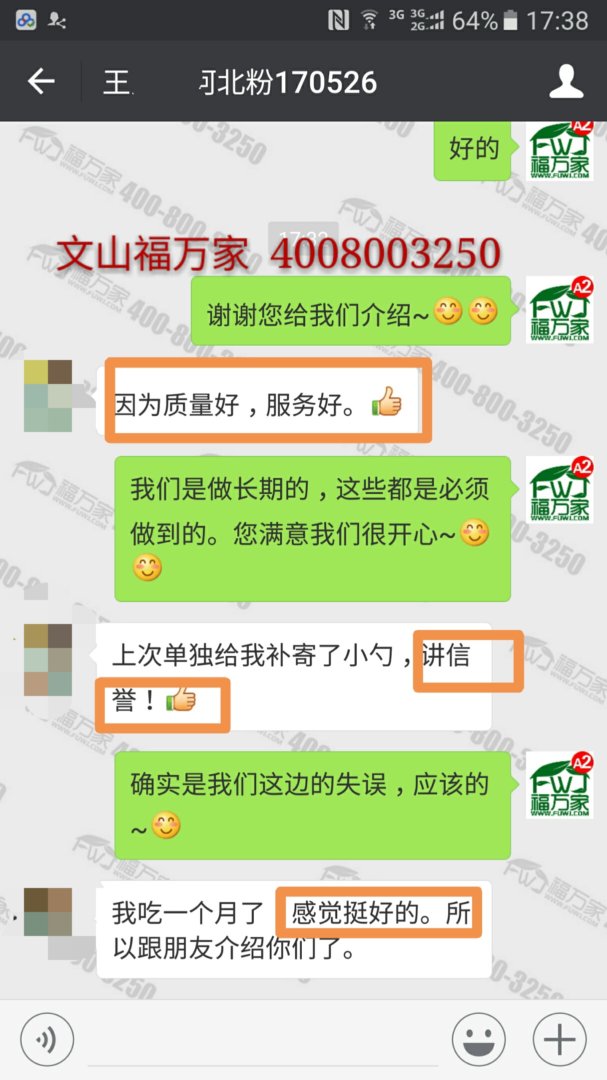 河北的王先生今天给我们反馈:因为质量好、服务好、讲信誉,所以把我们介绍给他的朋友。另外他自己吃了福万家三七粉一个月了,感觉挺好的。具体咨询:4008003250