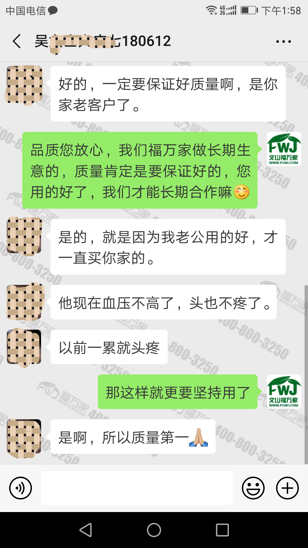 大庆吴女士的爱人有高血压,累的时候就会头痛。坚持用了一年多的福万家三七,最近反馈血压不高了,头也不痛了。