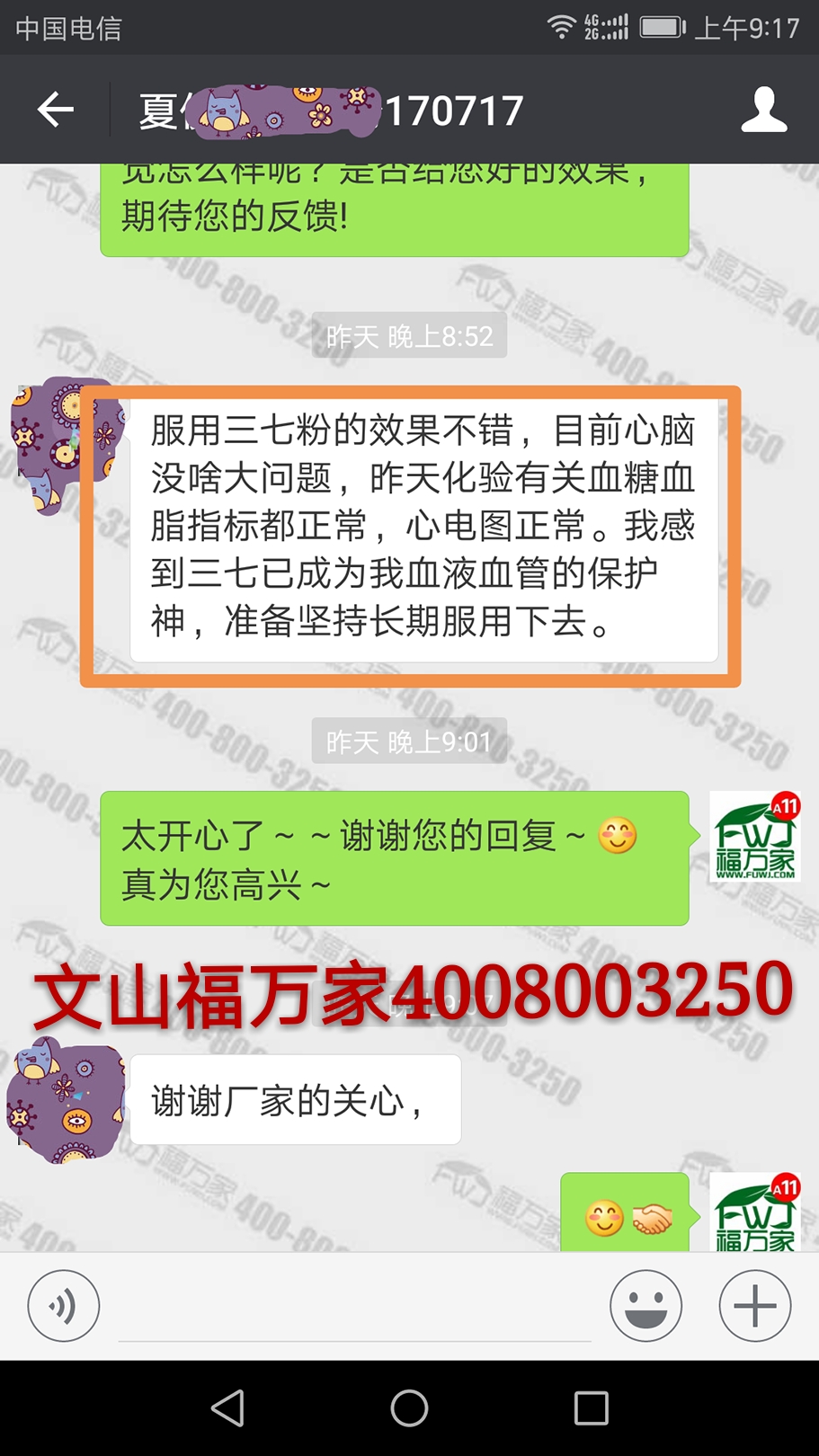 夏女士吃福万家三七将近5个多月的时间,最近反馈“去医院检查化验有关血糖血脂指标都正常,心电图正常。”还说三七已成为血液血管的保护神,准备坚持长期服用下去。