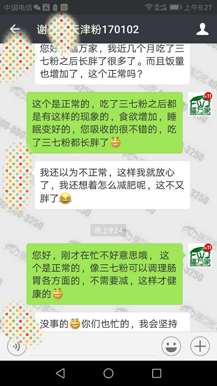 天津谢女士吃福万家三七5个多月,给我们反馈说:吃了三七之后长胖了很多了,饭量也增加了,现在差不多都要减肥了。三七对调理肠胃个方面效果都是很好的,温馨提示一般肠胃不好的人,建议吃了饭在吃三七,这样减少对肠胃的刺激。具体咨询:4008003250