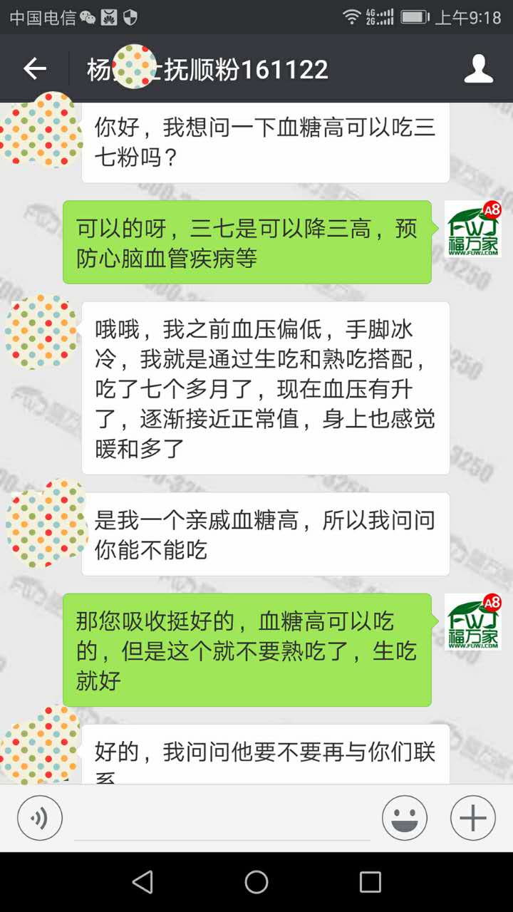 抚顺的杨女士之前血压偏低,手脚冰冷,用福万家三七粉生吃和熟吃相互搭配,吃了七个月左右,现在血压有升了,而且逐渐接近正常值,身上也感觉暖和多了。