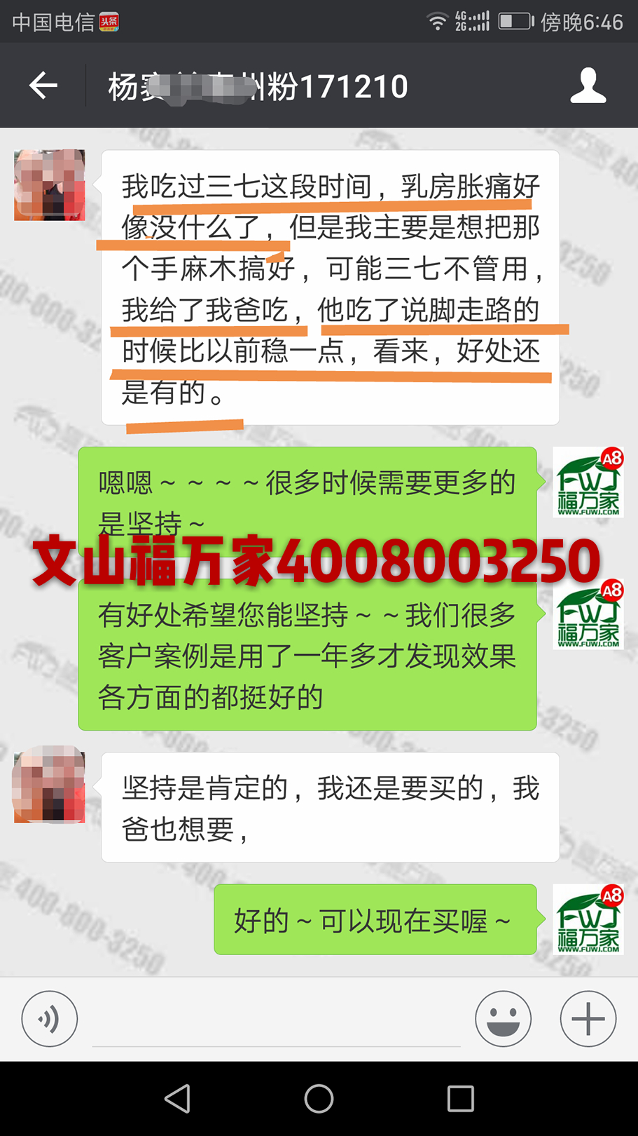 惠州的杨女士有乳腺增生, 乳房时常会胀痛。吃福万家三七后反馈,乳房胀痛的情况就没有了。另外给她父亲也喝了一些,她父亲喝以后脚走路也比以前稳一点了。文山福万家,更多反馈:http://www.wskwj.com.cn/kehufankuianli/