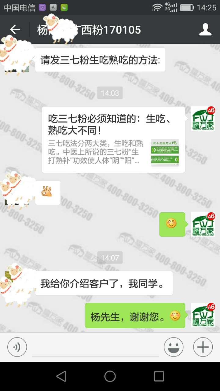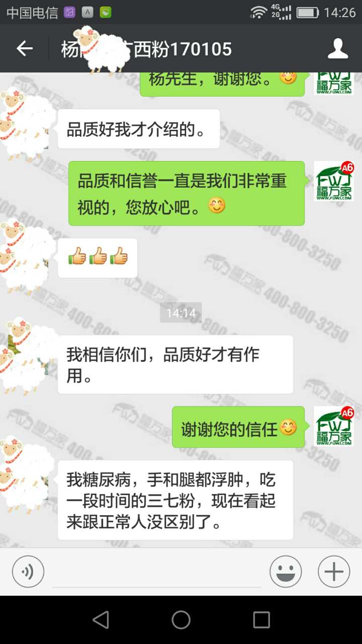 广西的杨先生有糖尿病,手和腿都是浮肿的,吃福万家三七粉四个多月,现在手腿看起来跟正常人没区别了。他自己用的效果好,相信我们的品质,还把我们介绍给他的同学。