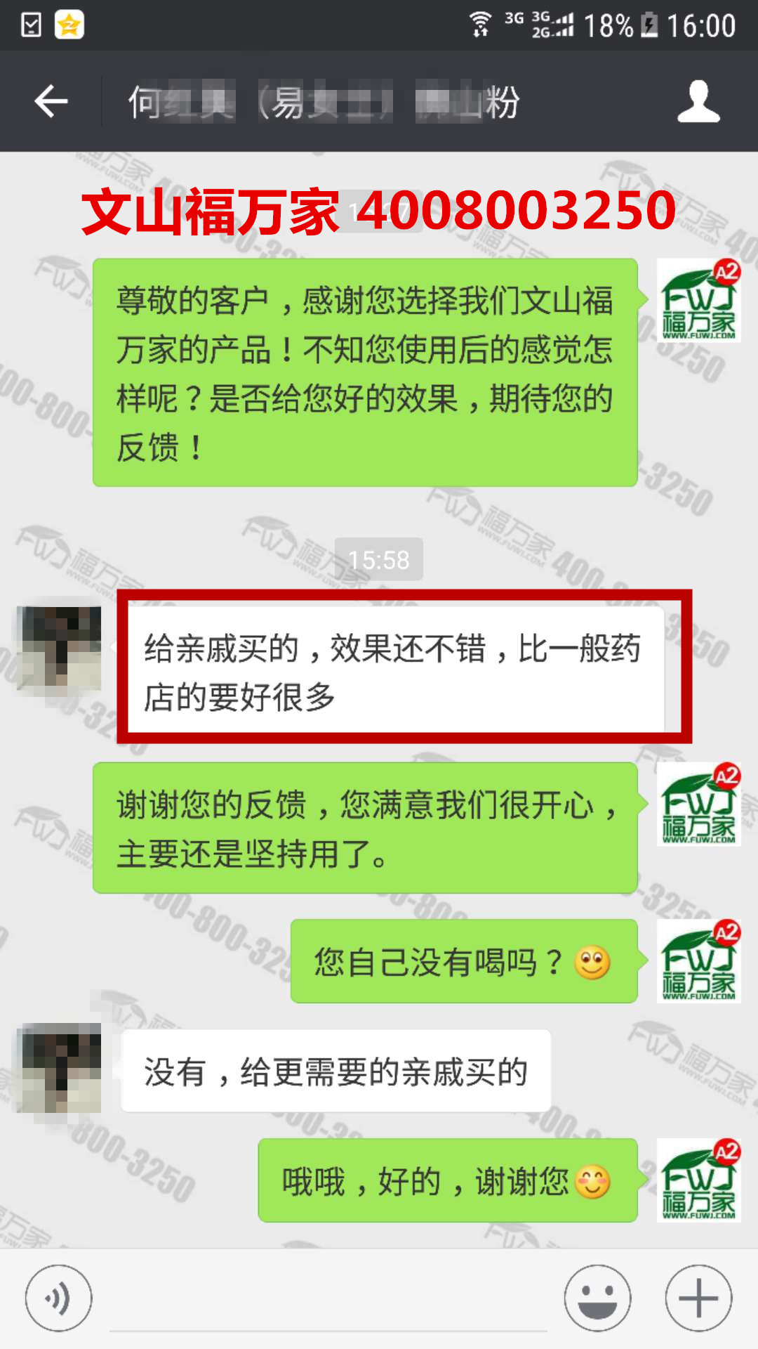 广东易女士反馈福万家三七她是给亲戚买的,效果不错,质量比一般药店要好很多。之前也反馈她父亲用的也不错,睡眠明显改善,因骨质增生引起的腰疼次数也减少了。