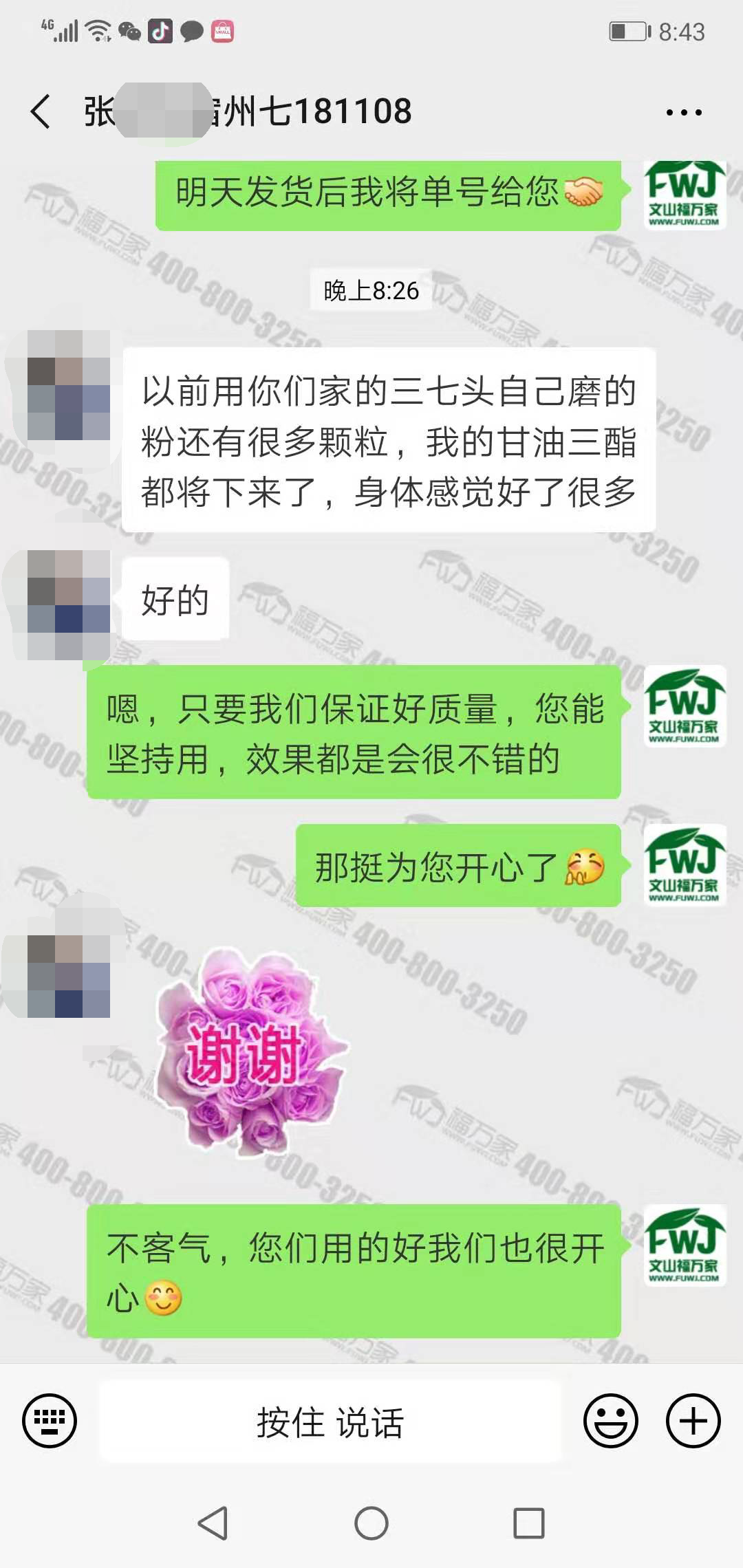张女士吃福万家三七差不多一年,最近再买的时候反馈甘油三脂降下来了,身体感觉好了很多,自己打粉很粗,让我们直接帮忙打粉。