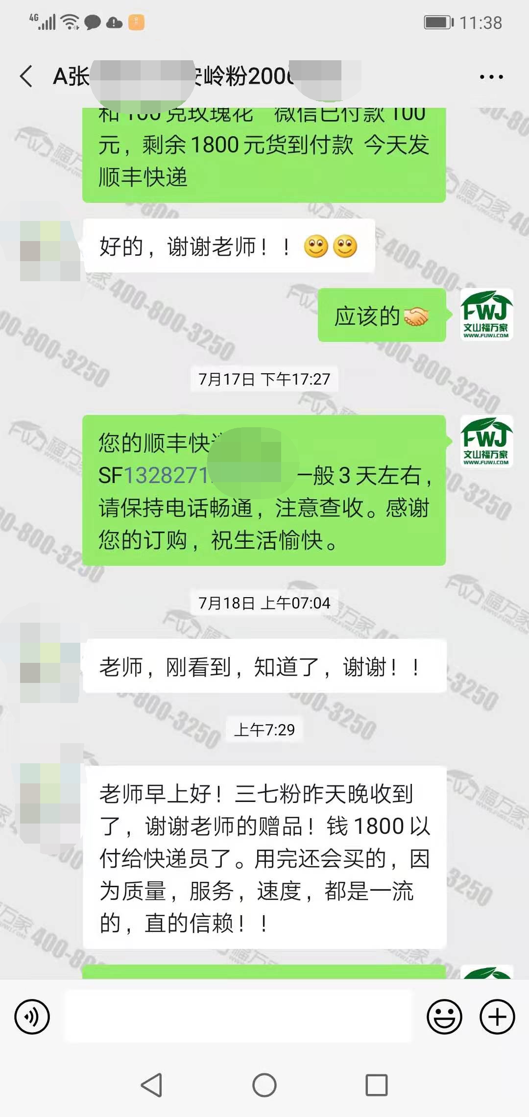 张女士一直在吃我们三七,用的效果不错,这次收到后反馈对我们福万家三七质量、服务、速度都很满意。