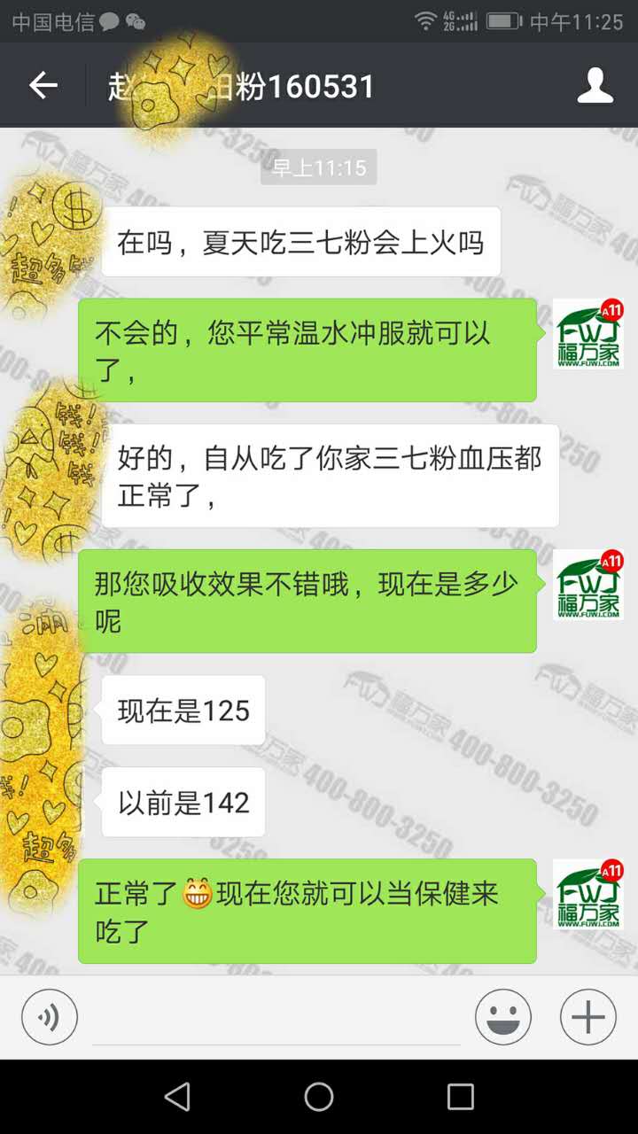 赵女士吃福万家三七粉有1年的时间了,今天反馈说:血压正常了,以前高压是142的,一直坚持吃三七粉,现在血压已经在正常范围了,现在是125了。