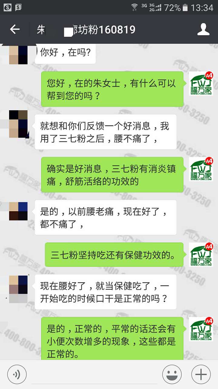 朱女士用了7个多月的三七粉,今天反馈说,自从吃了三七粉之后,现在腰不痛了,现在吃三七粉主要是为了保健。文山福万家,更多反馈: http://www.wskwj.com.cn/kehufankuianli/