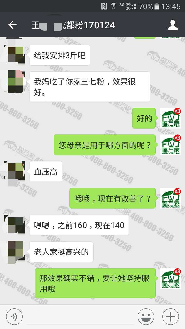 成都王先生的母亲有多年的高血压,服用福万家三七粉3个月左右,血压就降下来了。从之前的160降到了140,效果很不错。