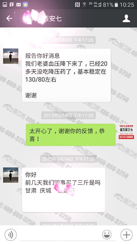 西安的胥先生,2015年2月17日打电话咨询了解后在我们官网上提交了订单,我们安排发货。之后就加了微信。他是直接买的三七块,后面在微信上也咨询打粉的问题。在使用过程中也有在沟通交流。坚持用到2015年5月8日,给我们反馈说他老婆的血压降下来了,之前一直吃降压药的现在有20多天没吃的,血压都能稳定在130/80左右。自己很高兴,后面介绍了很多他周边的人加我们微信了解三七。下面是胥先生的反馈截图。