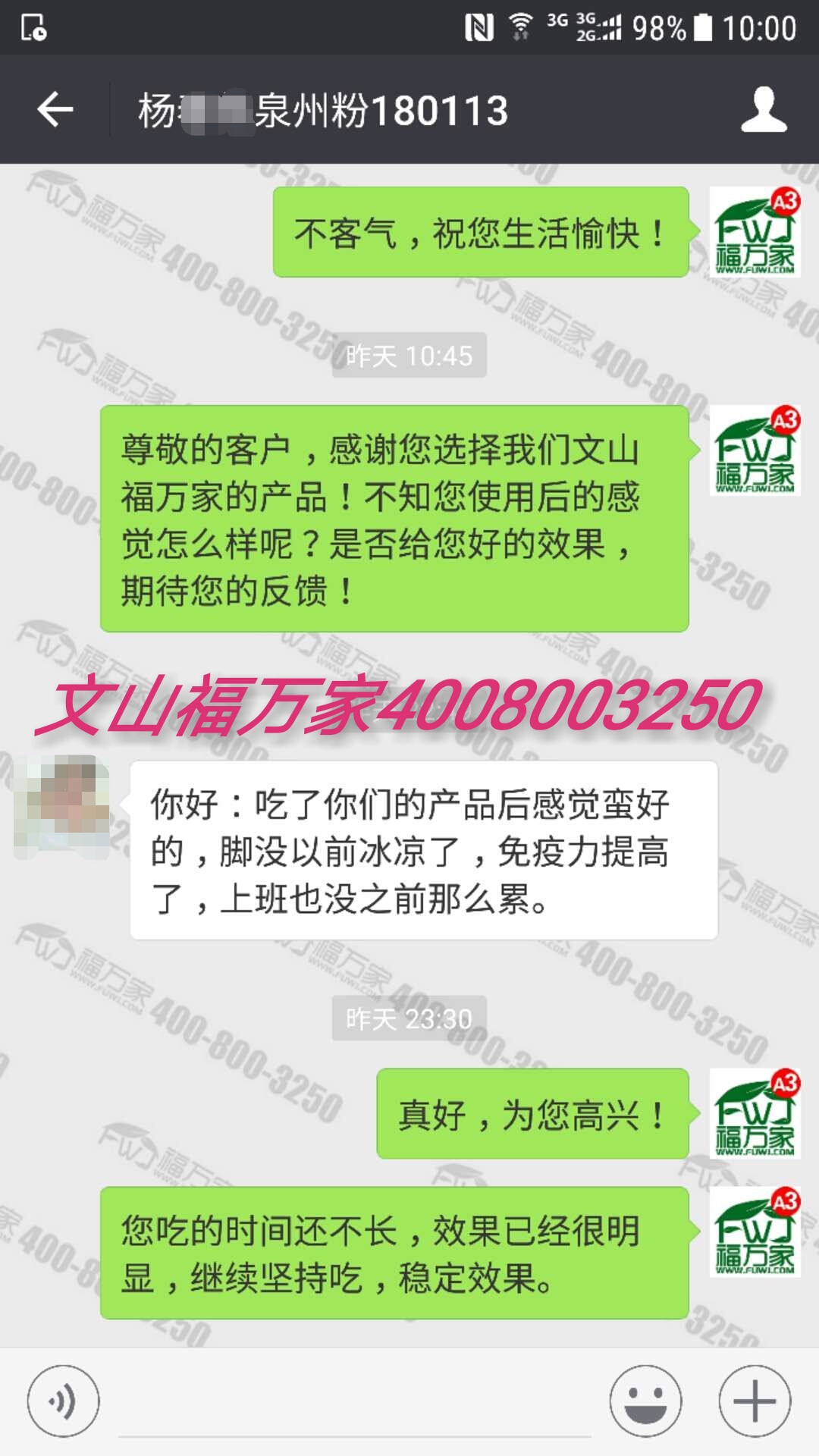 福建杨先生吃我们福万家三七3个多月,反馈:感觉蛮好的,脚没以前冰凉了,免疫力提高了,上班也没之前那么累。文山福万家,更多反馈:http://www.wskwj.com.cn/kehufankuianli/