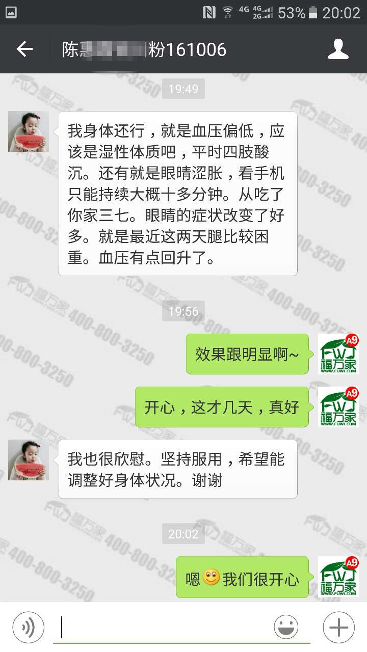 银川的陈女士有低血压,眼睛看手机十分钟就会出现涩胀的情况,在服用三七粉1个月后,血压也回升了,眼睛的情况也改善了好多。具体咨询:400-800-3250