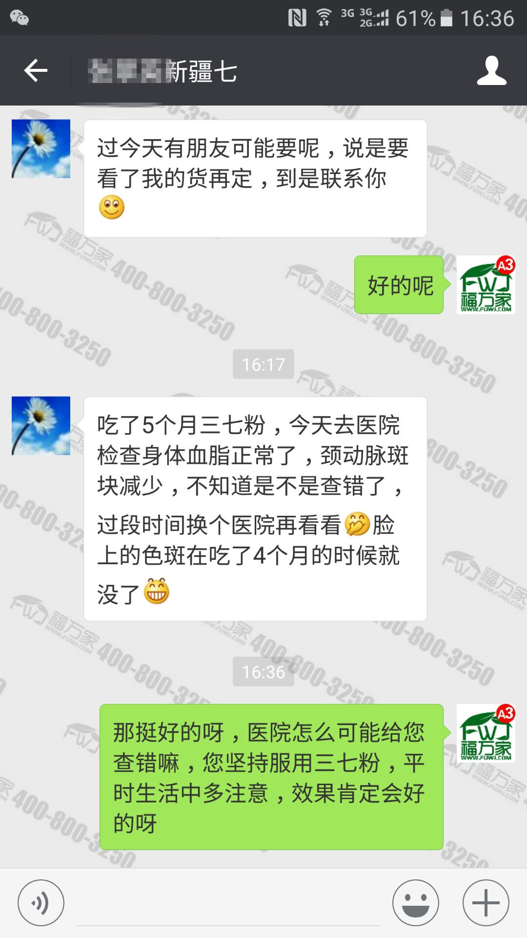 新疆的张女士在购买我们福万家购买三七之前,对三七也是做足了功课,算是比较了解三七了。后来是在个众多卖家中选择了我们,很感谢张女士对我们的信任和支持。张女士本身是血脂比较高,劲动脉有斑块,在服用了5个多月的三七后,张女士很高兴的给了我们反馈。血脂正常了,劲动脉斑块也减少了。更好的是脸上的色斑才吃三七粉4个月就消失了。这样的效果,和张女士每天坚持服用三七粉是分不开的,三七不是仙丹,不会一吃就见效,但是只要坚持了,就会有效果的。具体咨询:400-800-3250