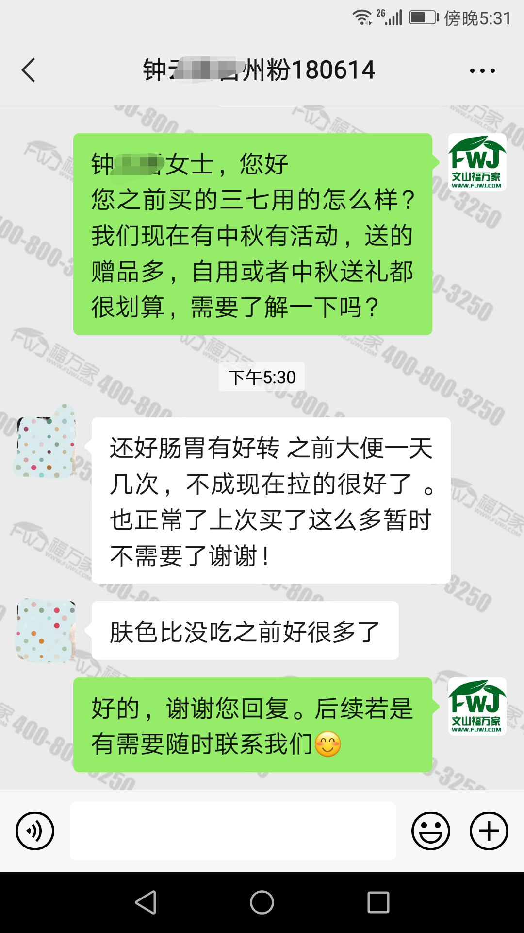 钟女士反馈吃我们福万家三七后,肠胃有好转,大便正常,肤色也比之前好很多。