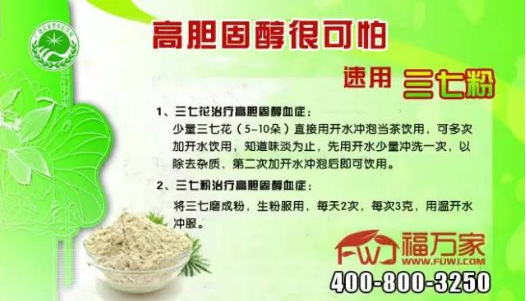 三七是我国较早发掘使用的传统名贵药用植物之一。属五加科人参植物,含21种皂甙,17种氨基酸、17种微量元素,包括世界公认的抗癌元素硒及人体必须的Vb、Ve维生素、脂肪、蛋白等。因此高胆固醇血症的朋友,可用下面两种方法治疗高胆固醇血症: