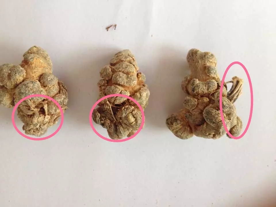 这个是商家处理前自然形态的剪口。通过特定手段,将刚挖出来的三七,用橡皮筋,将剪口部位与三七主根绑定在一起,当其晒干后,再去掉皮筋,这样可以将剪口与三七完美的嵌合在一起。使其增重、个头大、达到卖高价的目的。也是市场上大头三七绝大部分是带剪口的原因。