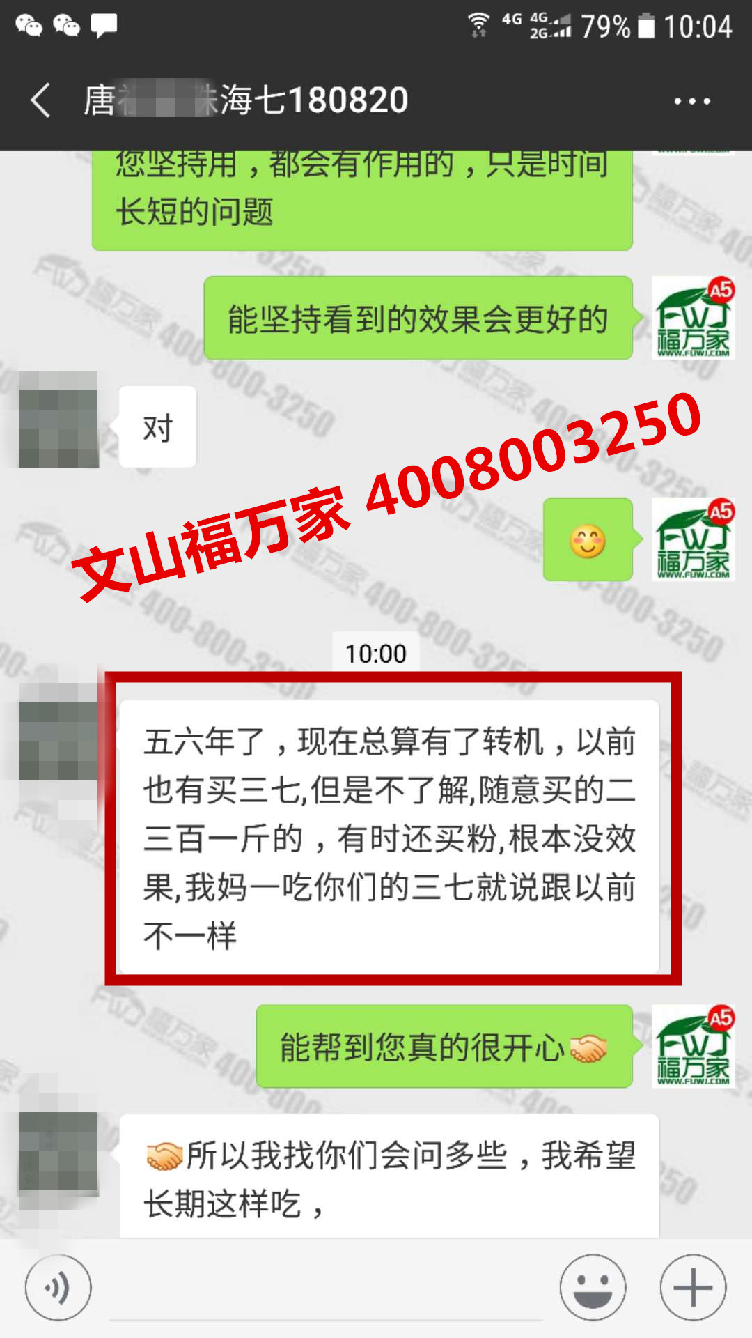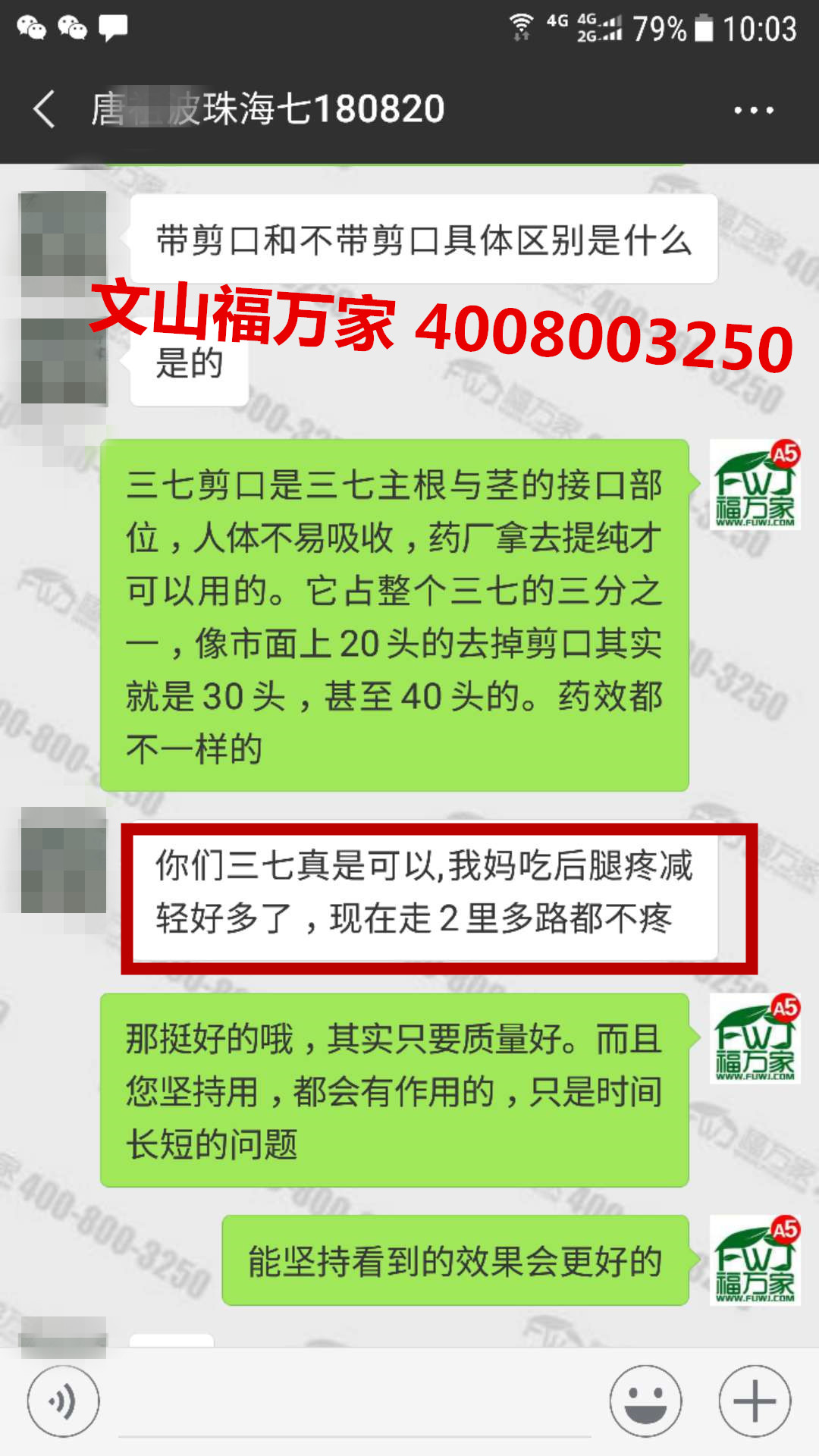 珠海唐先生很认可我们福万家三七质量,反馈他母亲吃后腿疼减轻好多了,现在走2里多路都不疼,五六年了终于有了转机。之前也买过三百一斤的三七或者三七粉,根本没有效果。