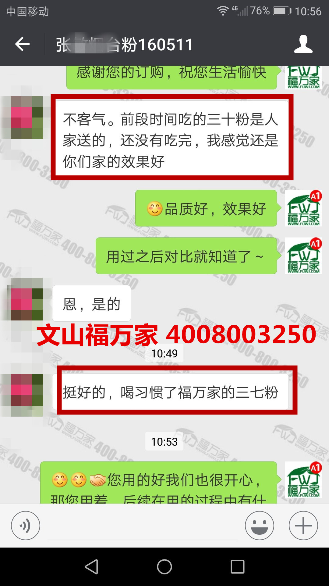 烟台张女士喝我们三七两年多,反馈用的挺好的,已经习惯了福万家三七,中间有用过别人送的,但是效果还是我们的好。