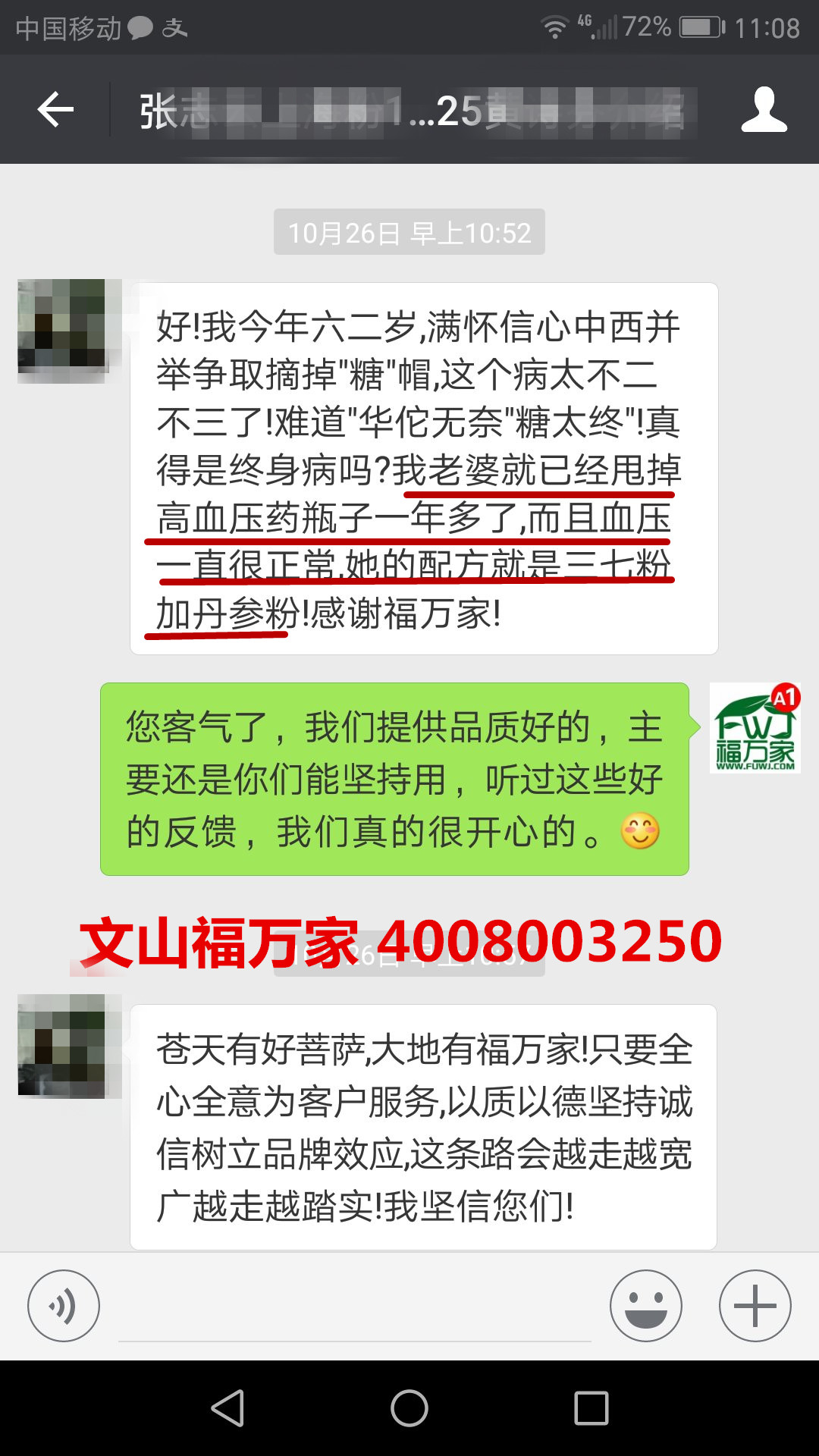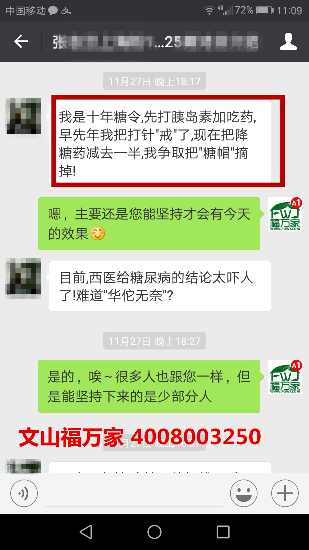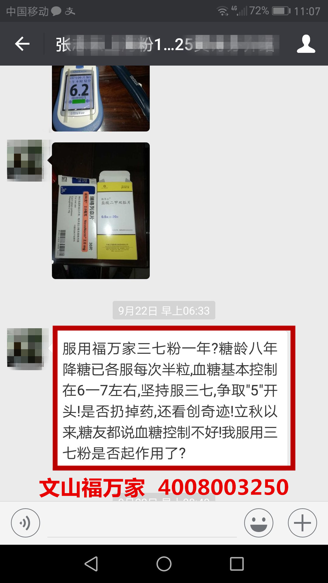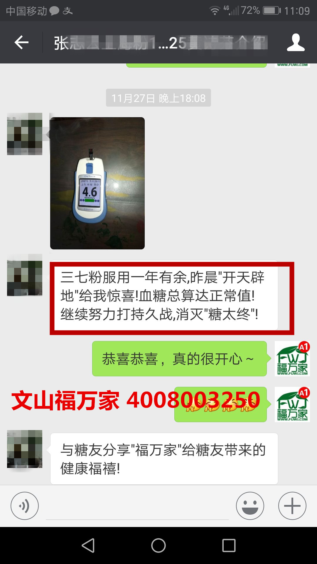 上海张先生糖尿病很多年了,之前打胰岛素加吃药。吃福万家三七整一年的时候停掉打胰岛素,降糖药各服用半粒,血糖基本控制在6-7之间。前几天很开心的与我们分享血糖已经降到4.6了。
